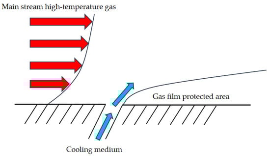 In the design and development of modern aviation gas turbine engines, the temperature before the turbine is a critical indicator of engine performance. A higher turbine inlet temperature provides more powerful thrust, becoming a key factor that limits engine performance [1]. Turbine blades are subjected to direct impacts from high-temperature gases in the combustion chamber. Compared to the forces exerted by gas flows and the vibrational loads during operation, thermal loads are the primary form of load on the blades during operation. A higher turbine inlet temperature means that the blades need to withstand greater thermal loads. The study of blade resistance to thermal damage is vital for enhancing engine overall performance and has become one of the hotspots in engine design research [2]. As turbine inlet temperatures rise, relying solely on the heat-resistance of the blade materials is no longer sufficient. Continuous research by scholars globally has led to the gradual adoption of various efficient cooling techniques in blade design and use [3,4], such as convective cooling, impingement cooling, film cooling, effusion cooling, and thermal barrier coatings. Blades have evolved from solid to hollow structures, incorporating intricate internal cooling channels. Introducing cool air inside turbine blades effectively reduces the duration of high temperatures experienced by the blades, alters the temperature gradient, and diminishes the thermal stress on the blades, thereby enhancing their fatigue life. Gas film cooling technology (GFCT) is increasingly used in the design of turbine blades due to its effective cooling performance.