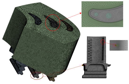 The structure of film-cooled turbine blades is complex, making mesh generation challenging, particularly as different turbulence models in thermo-fluid coupling calculations impose stringent requirements on the near-wall mesh size [20]. Obtaining a high-quality mesh structure while ensuring the micro-grid dimensions near the wall is a technical challenge in mesh generation. During the mesh division process, a boundary layer is added to the surface of the gas domain passing through the blade, and the thickness of the first layer of the mesh (denoted as y) is ensured to meet the requirements of the turbulence model. Simultaneously, the mesh is refined around areas with transitional filets such as film cooling holes and disturbance columns. Ultimately, the mesh count was set to 3 million (Figure 5).