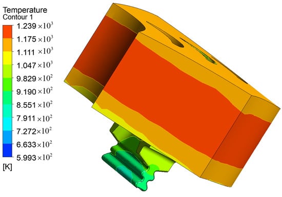 represents the inlet temperature of the mainstream gas, expressed in Kelvin (K), and represents the radial coordinate originating from the base of the blade dovetail, expressed in meters (m). Figure 6 depicts the temperature distribution curve of the total temperature of the high-temperature gas along the radial direction ( represents the percentage of the blade’s radial height). Figure 7 shows a temperature distribution cloud diagram at different radial heights of the intake, validating the feasibility of this method. The remaining boundary condition parameters are shown in Table 1.