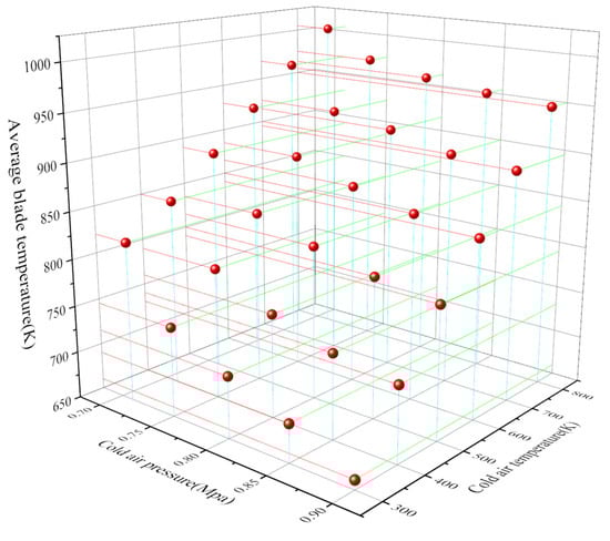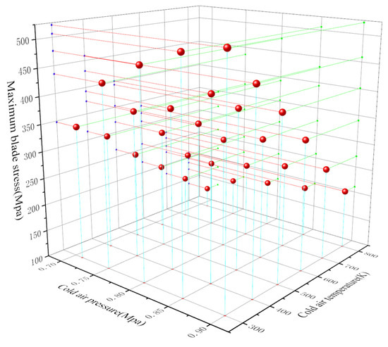 From the temperature line graph (Figure 9), In the figure, the red bullet represent blade temperature it can be seen that the average temperature of the blades decreases as the cooling gas temperature drops. Especially during the process where the cooling gas temperature increases from 400 K to 600 K, the temperature gradient of the blades changes significantly. After the cooling gas temperature exceeds 700 K, the average temperature of the blades during the thermal shock process reaches 900 K, which exceeds the material’s endurance usage temperature. The material may undergo creep failure and the fatigue life of the material will significantly decrease. At the same time, the average temperature of the blades also decreases as the cooling gas pressure increases. The rate of temperature change in the blades is the greatest when the cooling gas pressure changes from 0.71 to 0.75. And as the cooling gas temperature increases, the decreasing trend gradually becomes gentler, indicating that when the cooling gas pressure is higher than 0.9 MPa, further increasing the cooling gas temperature will not cause a significant improvement in the cooling effect.