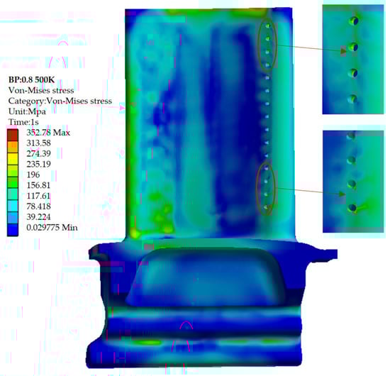 Blade stress distribution and local magnification diagram under 0.8 Mpa and 500 K cooling air.