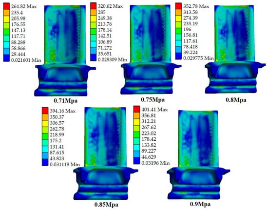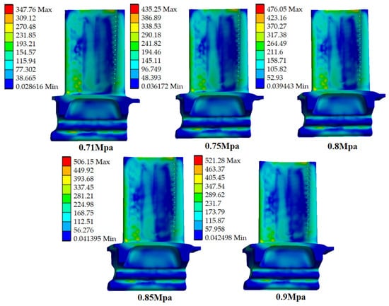 The stress conditions of the blade under different cold gas pressure conditions with cold gas temperatures of 300 K and 500 K were analyzed through calculations. The obtained stress distribution cloud diagrams are shown in Figure 11 and Figure 12.