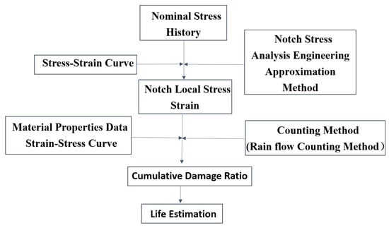 In 1961, Neuber proposed the relationship between nominal stress–strain and local stress–strain in notched parts, known as the Neuber formula. The strain–life equations proposed by Coffin and Manson have gradually developed into a method for estimating the life span of part cracks, namely, the local strain method. This method has been widely applied in the design of structural fatigue strength in fields such as aviation and automotive. Based on the strain–life relationship, the damage caused by the full cycles extracted can be calculated. The relationship between strain amplitude and life, namely, the Manson–Coffin equation is as follows: