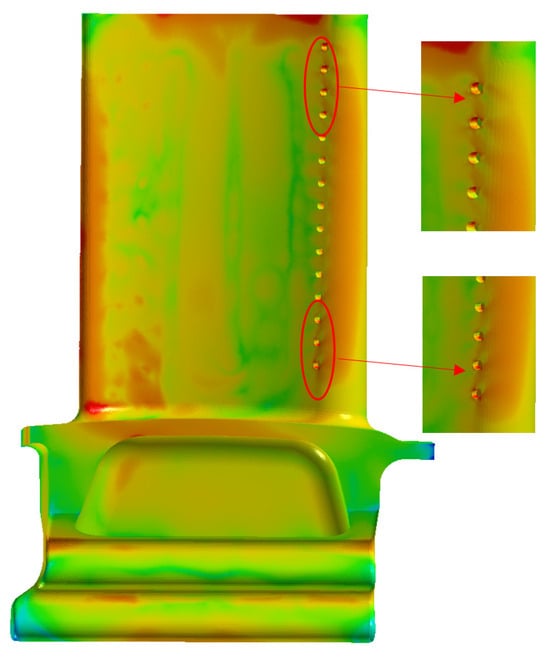 - Although the film holes effectively reduce the blade surface temperature, they damage the structural integrity of the blade. Stress concentration areas appear around the film holes, with the stress increasing by approximately 150 MPa compared with other parts of the blade surface.