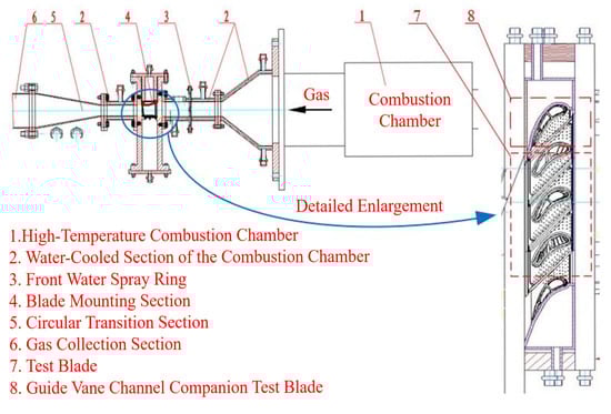 Principle of Thermal Shock Test. As shown in Figure 20, the core components of the tester, including the combustion chamber and the thermal shock test section. As indicated by 4 in the figure below, it shows the blade installation position within the test section. Inside the installation section, to ensure that the external flow field around the blade matches the flow field within the blade cascade channel, a blade is added next to the test blade as a reference blade, to ensure the flow field experienced by the blade conforms to reality, and by connecting the end plates of the reference blade and test blade, circumferential constraints on the test blade are applied, with a local magnification of the blade cascade channel formed by the reference and test blades shown in the right part of the figure above.