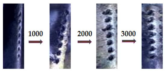 - After 1000 cycles of testing, fatigue damage traces are found at the film holes of the film-cooled blade. As the test proceeds, the damage size gradually increases. After 3000 cycles, the film holes are basically failed, with the film holes near the blade tip suffering the most severe damage.
