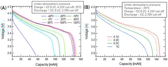 Figure 2A shows the temperature dependence of the ASSB discharge characteristics. Charging was conducted at 25 °C under a constant current (CC) of 0.1 C. The discharge was conducted at a CC of 0.1 C with a cut-off voltage of 2.7 V. From 25 °C to 60 °C, the discharge capacity increases with higher temperatures due to a reduction in internal resistance. However, at temperatures above 80 °C, a slight decrease in discharge capacity is observed; however, within the temperature range of 25 °C to 120 °C, the difference in discharge capacity remains within 5%, indicating stable discharge characteristics. Below 0 °C, the discharge capacity significantly decreased because of the increase in internal resistance. However, even at −40 °C, more than 30% of the discharge capacity at 25 °C can be obtained, indicating that the battery remains dischargeable. Discharge characteristics below −40 °C have not been obtained; however, a further increase in internal resistance at such low temperatures is expected to result in a more pronounced voltage drop.