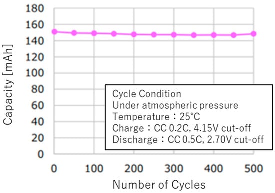 Figure 3 shows the capacity retention during continuous charge–discharge cycles at 25 °C. The conditions for continuous charge–discharge cycling were as follows: the charging current was 0.2 C with a cut-off of 4.15 V, and the discharge current was 0.5 C with a cut-off of 2.70 V. Capacity checks were conducted every 50 cycles at a rate of 0.1 C for both charging and discharging. After 500 cycles, the ASSB retained over 97% of its initial capacity, demonstrating excellent charge–discharge cycle characteristics.