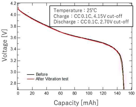 A vibration test was conducted to evaluate the tolerance of ASSBs to the vibrations experienced during the rocket launch phase. Table 2 lists the conditions of the sinusoidal and random vibration tests. The vibration test was conducted in all axial directions (X, Y, and Z), with the same conditions for each axis. These conditions were set based on those expected for components of satellites mounted on a typical launch vehicle, such as the H-IIA rocket. Assuming that the battery was in a fully charged, non-operational state during launch, the test was conducted at a 100% state of charge under open-circuit conditions. Figure 4 shows the discharge characteristics before and after the vibration tests. Because the sinusoidal and random vibration tests were conducted consecutively, the discharge characteristics were obtained before and after both tests. Because there was no significant change in the discharge profile and appearance of the ASSB, it was confirmed that the ASSB was tolerant of the vibrations experienced during the rocket launch. Ensuring vibration tolerance in LE-LIBs is challenging because the electrode mass inside the battery is not fixed within the casing. In contrast, ASSBs are expected to have better vibration tolerance since their internal electrodes remain stationary.