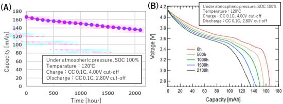 (A) Change in the discharge curves during the 120 °C storage test. (B) Transition of the discharge capacity during the 120 °C storage test.