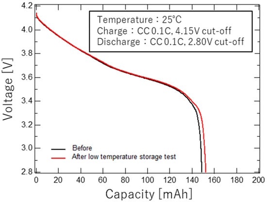 As demonstrated in Figure 2, the internal resistance of ASSBs increases significantly at low temperatures, resulting in a larger voltage drop. Hence, the operational discharge temperature range for ASSBs is limited to above −40 °C. During eclipse periods, it is feasible to maintain the battery temperature above −40 °C using insulation or thermal control. However, if thermal control is not possible due to energy conservation measures or power shortages, the temperature may drop below −40 °C. The low-temperature storage performance of ASSBs was evaluated by assessing the discharge characteristics after 800 h of exposure to −100 °C. As shown in Figure 7, no abnormalities were observed in the discharge characteristics at 25 °C before and after exposure to −100 °C, and no degradation in capacity was detected. Owing to the absence of the electrolyte phase-change mode resulting from the solid electrolyte, ASSBs exhibit minimal structural changes even at low temperatures, indicating a high potential to withstand the harsh nighttime lunar conditions.