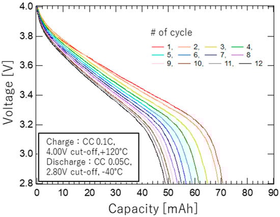 The discharge characteristics of each cycle are presented in Figure 8. Due to the discharge rate of 0.05 C and the high charging temperature, the discharge capacity during the first cycle was more than 10% higher than the discharge capacity at −40 °C shown in Figure 2. Although the discharge capacity decreased with each cycle, more than 70% of the first cycle capacity was retained after 12 cycles. This indicates that ASSBs have the potential to be suitable for one year of lunar operation. Because simulated charge–discharge cycling equivalent to one year on the lunar surface showed significant capacity degradation, future investigations will require SEM, EDS, and XPS analyses to elucidate the degradation mechanisms.