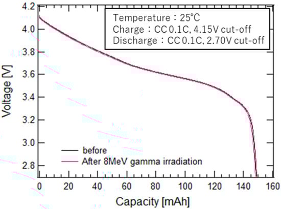 To evaluate the radiation tolerance of ASSBs, gamma-ray irradiation tests were conducted on individual cells at dose levels of 2 Mrad and 8 Mrad, and the impact on electrical performance was assessed based on the discharge characteristics before and after irradiation. The discharge characteristics before and after 8 Mrad gamma-ray irradiation are presented in Figure 9. No abnormalities were observed in the discharge characteristics at 25 °C before and after gamma-ray exposure to radiation levels up to 8 Mrad. The capacity retention of the ASSB after exposure to 2 Mrad was 99.6%, and a similar retention of 99.6% was observed even after 8 Mrad exposure, suggesting that there was no significant degradation associated with the increased gamma-ray radiation dose. Considering that the total radiation dose over ten years is estimated to be less than 1 krad both in low Earth orbit [17] and on the lunar surface [18], it can be concluded that the ASSBs pose no issues in terms of radiation tolerance for space applications.