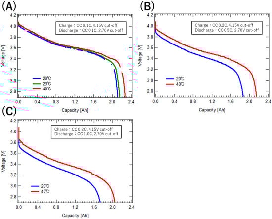 The discharge curves obtained in orbit at varying battery temperatures, charge rates, and discharge rates are presented in Figure 12. Figure 12A shows the 0.1 C discharge curves following 0.1 C charging at battery temperatures of 20 °C, 23 °C, and 40 °C. As predicted from the temperature dependence of the discharge characteristics, the discharge capacity increased at higher battery temperatures. The respective discharge capacities were 2.11 Ah, 2.16 Ah, and 2.27 Ah. As illustrated in Figure 12B,C, the 0.5 C and 1.0 C discharge characteristics indicate that the initial voltage drop upon discharge commencement becomes more pronounced at higher discharge rates. For example, during the 0.5 C discharge, the voltage drop was 0.14 V at 20 °C and 0.12 V at 40 °C, whereas during the 1.0 C discharge, the voltage drop increased to 0.24 V at 20 °C and 0.21 V at 40 °C. Since these voltage drops are larger than the values for single cells, as shown in Figure 2B, they are assumed to be caused by harness resistance and contact resistance at the connection of 15 parallel modules. Under all conditions, the temperature and discharge rate dependencies exhibited trends consistent with the characteristics presented in Section 2. This confirms that the ASSB operates reliably in space, maintaining stable charge–discharge performance.