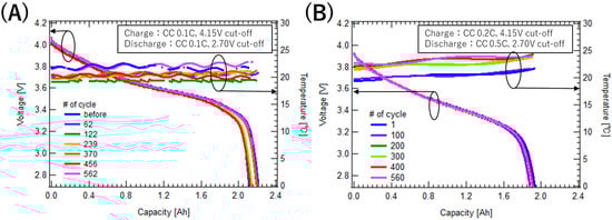 Evolution of discharge curves in the continuous charge–discharge cycle test: (A) 0.1 C CC charging and 0.1 C CC discharging for capacity verification, and (B) 0.2 C CC charging and 0.5 C CC discharging during continuous charge–discharge cycles. The arrows extending from each curve indicate the corresponding axis.