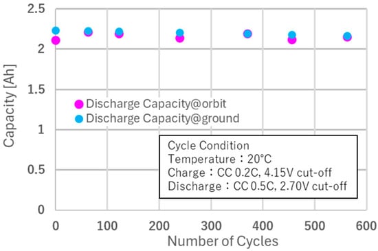 To evaluate the lifespan characteristics of the ASSB battery, charge–discharge cycle tests were conducted at a battery temperature of 20 °C, using 0.2 C CC charging and 0.5 C CC discharging. During the cycle tests, charge–discharge characteristics were periodically measured under 0.1 C CC charging and discharging conditions to assess the transition in discharge capacity. Figure 13A depicts the transition of the 0.1 C discharge characteristics, while Figure 13B presents the transition of the 0.5 C discharge characteristics during the continuous charge–discharge cycle test. Figure 14 shows the transition of the 0.1 C discharge capacity, comparing data from the space-demonstrated battery with data obtained using a single cell from the same production lot stored on the ground. Ground-based data were acquired under the same conditions as those in the on-orbit tests, with the discharge capacity multiplied by a factor of 15 to account for the parallel configuration of the space-demonstrated battery.
