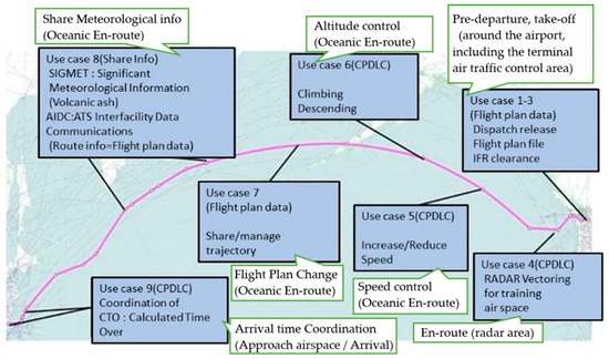 In case 7, trajectories were monitored to share and manage each aircraft with the relevant stakeholders. Mainly contains route information, which had the same type of content as flight plan data. Therefore, cases 1–3 and 7 were considered to be the same, and one flight plan was considered as the amount of information per aircraft.
