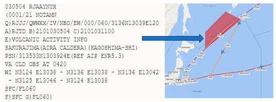 Example of the text data for the constraint information regarding volcanic ash from the NOTAM (left) and an example of the visualized image based on the text data (right).
