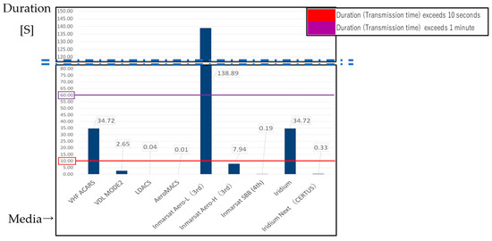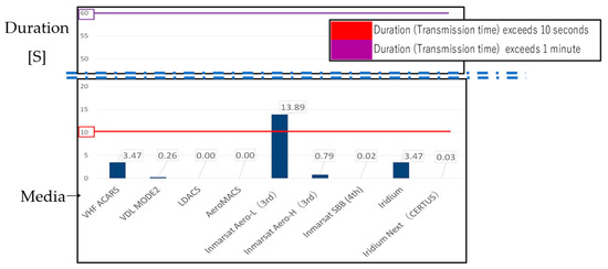 From the supply and demand analysis, we found that the four media that could meet all communication performance requirements for flight plan data, ATC (CPDLC), and NOTAM (volcanic ash information) in the TBO [3] demonstration scenario and could communicate with more than 10 aircraft were as follows: LDACS [35], AeroMACS [36], Inmarsat 4th generation SBB, and Iridium Next. However, LDACS [35] is only available over continental areas, and AeroMACS [36] is only available over airport surfaces, so the only two communication technologies that can be used for the whole period from before departure to arrival are the Inmarsat 4th generation SBB and Iridium Next. Since these two media are satellite communications, it is only natural that they can be used borderlessly. Furthermore, with regard to high-quality image data, it was found that under almost all conditions, the media that are currently available or will be available in the near future, other than LDACS [35] and AeroMACS [36], do not satisfy the performance requirements, and when handling color images, the duration exceeds 10 s. For these reasons, the challenges are dealing with the increase in the number of aircraft that can meet the required communication performance standards, and addressing the particularly long duration needed for handling image data. Another challenge is that all media transmit ATC (CPDLC) data, which requires time-critical communication performance, mixed with other information on a single channel. As a result, this will not only delay ATC (CPDLC) messages but also cause them to miss the opportunity to send out data if the communication channel is congested. This means that measures must be taken to avoid delays and line occupancy.