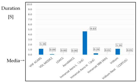 According to the results, for (1) flight plan data, when the required performance was 10 s, the number of suitable aircraft was extremely small, at less than 5 for VHF ACARS, VDL MODE2, Inmarsat Aero-L&H (3rd), and Iridium Next. Even when the required performance was more relaxed, allowing 60 s, there was only a slight improvement. For (2) air traffic control (ATC) communications via CPDLC, the required communication performance for continental airspace—defined as RCP130 [50]—was achieved with single-digit performance margins when using Inmarsat Aero-L (3rd generation). However, for other communication technologies, including those supporting RCP240 [51], the results demonstrated an ability to achieve performance metrics exceeding double-digit margins, indicating sufficient capacity to meet the required standards. For (3) NOTAM (volcanic ash information), the results were almost identical to (1) flight plan data for 10 seconds, but improved in 60 seconds, with the lowest number of Inmarsat Aero L&Hs (3rd) with 4 and others in the double digits or more.