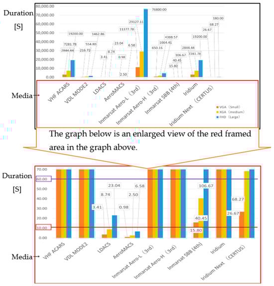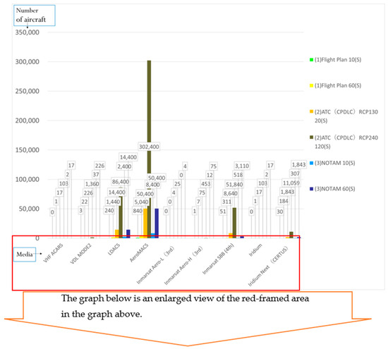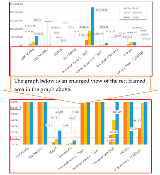 The number of aircraft that meet the communication performance requirements for high-quality image data is summarized in Table 5 and Figure 13. According to the results, the number of aircraft was almost zero in all media except LDACS [35] and AeroMACS [36]. Also, in the case of color images, which have a larger amount of data, the number of aircraft needed was in the single digits, even with AeroMACS [36], at a resolution of XGA or higher.