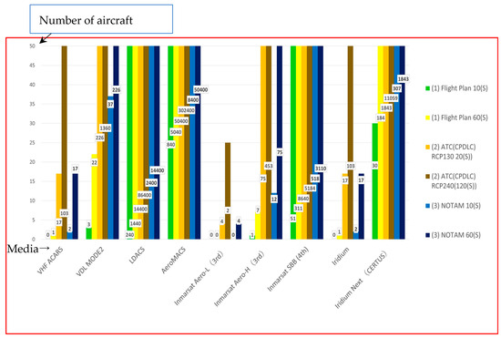 Table 4 and Figure 12 summarize the number of aircraft that will be sufficient to satisfy the communication performance requirements for flight plan data, ATC (CPDLC), and NOTAM (volcanic ash information). As shown above in the analysis of usefulness as a transmission method, the communication performance requirements for flight plan data and NOTAM (volcanic ash information) had not been defined, so they were similarly calculated as 10 s and 60 s.