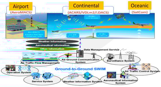 As a suitable implementation image, a conceptual diagram of seamless open-land SWIM [2] access is presented in the demonstration experiment to realize a secure aeronautical radio system, which represents a basic study on the ground, as studied by Kazuyuki Morioka et al. [43]. A schematic of its implementation is shown in Figure 14. However, the supply and demand analyses revealed that using ACARS and VDL in the land area shown in this image resulted in delays; therefore, the use of LDACS [35] was recommended for this study. In addition to LDACS [35], AeroMACS [36] is recommended for airports as a communication technology that can be used without delay.