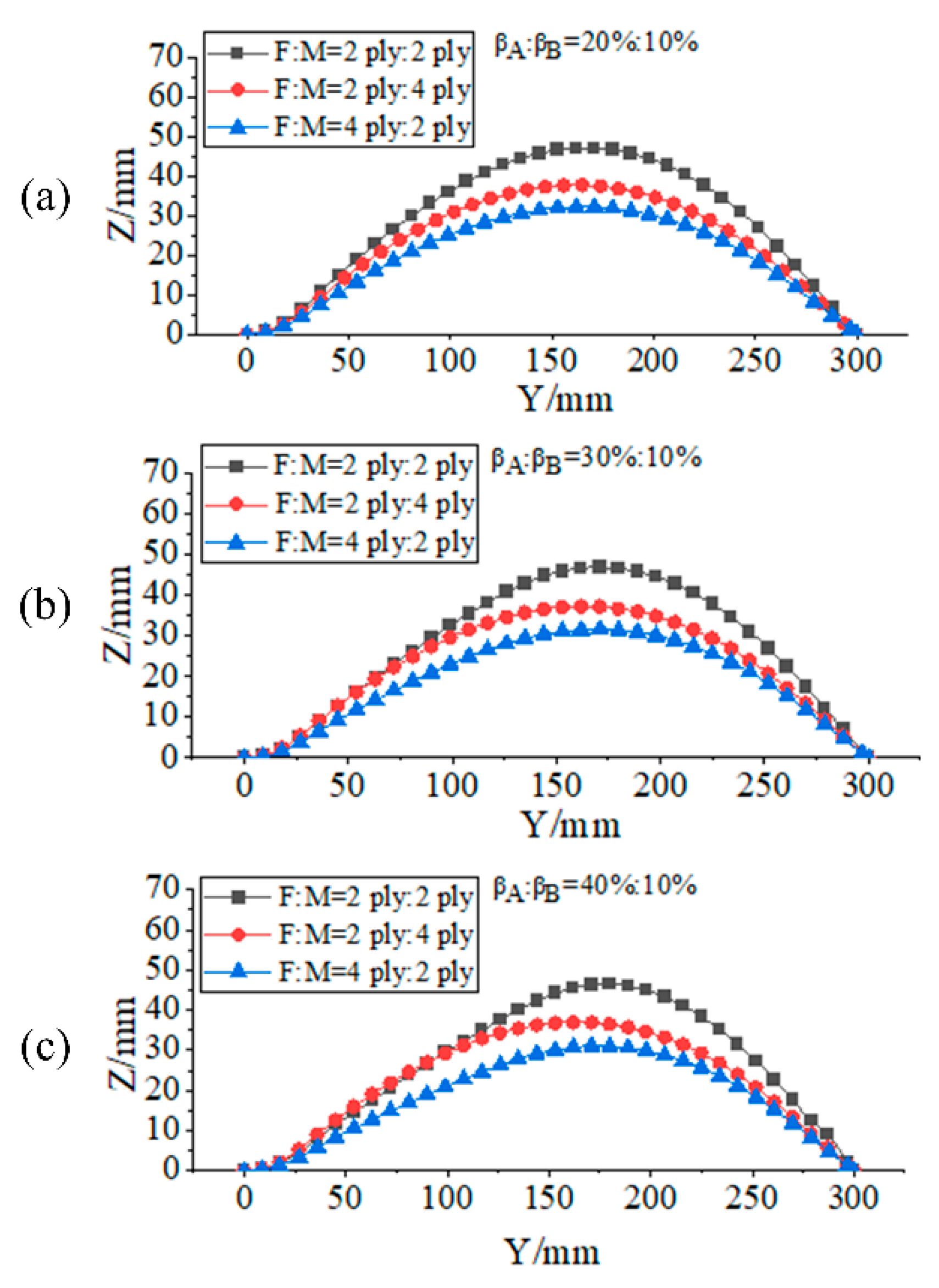 3.3. Influence of the Number of Layers and Layup Ratio of Two Materials on the Deformation Performances of Laminates