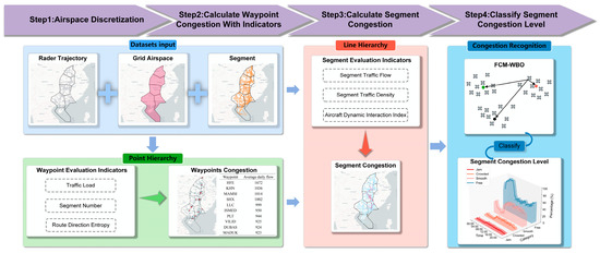 At the waypoint level, the airspace is gridded, and each grid cell is associated with a specific waypoint. Then, using selected waypoint evaluation metrics, the congestion status for each waypoint is determined. At the segment level, segment evaluation metrics and the congestion states of connected waypoints are combined to derive each segment’s congestion status. Finally, the FCM-WBO algorithm is applied to classify congestion patterns, enabling a refined analysis of air traffic congestion. Considering both computational time and accuracy, the final grid size selected is .