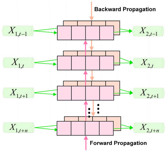 where , , and are the forgetting gate, input gate, and output gate, respectively. is the unit state, and is the model output. The outputs of the two are spliced to form the final output of BiLSTM, as shown in Figure 4: