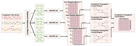 Based on nonlinear Granger causality, causal relationships are represented by the nonlinear functions and . The key challenge is how to extract congestion-propagation causal weights among segments from these nonlinear relationships fitted to time series data by a neural network. In deep-learning models, each segment’s input features—namely, its congestion state assessment values—affect the predicted output for the target segment. During training, the model gradually adjusts the weights through backpropagation and loss function optimization to quantify the relative contributions of these input features to the prediction. Thus, by analyzing the neural network’s weights, the specific congestion-propagation causal weights can be estimated [40]. However, since different models vary in structure and underlying principles, the particular methods for estimating congestion-propagation causal weights also differ. Therefore, after introducing the employed models in the following section, this paper will detail the specific calculation steps.