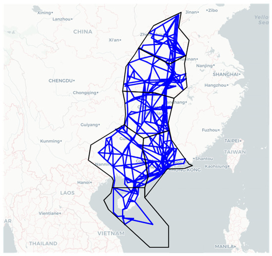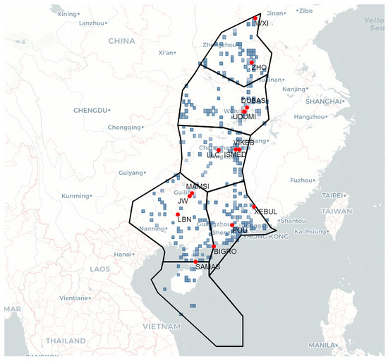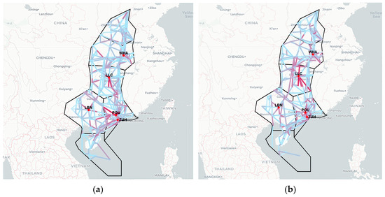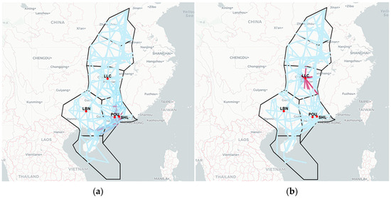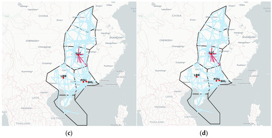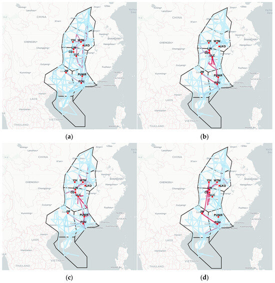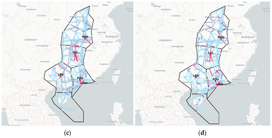 Figure 14 maps congestion-source segments in the Central and Southern regions under three time-lag conditions. In the original air route topology, segments with high out-degree centrality cluster mainly around waypoints LLC, POU, LBN, ZUH, and WHA and their adjacent airspace. When , these same areas dominate as congestion sources, indicating that short-term propagation primarily originates there. As , the spatial concentration remains similar, but the intensity of influence on neighboring segments diminishes—as reflected by lighter shading in the heatmap. At , the prominence of LLC, POU, and WHA further declines, and congestion sources begin to shift toward shorter, east-west-oriented segments. This shift is consistent with the initial congestion origins identified in earlier analyses.