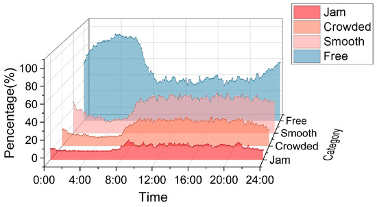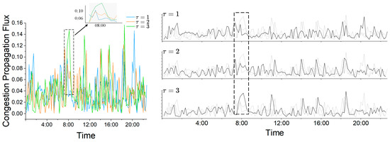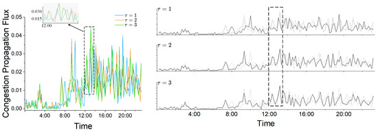 As shown, during both the pre-dawn hours and the peak period, the patterns closely mirror those in Figure 20, consistent with the previously established congestion-propagation dynamics. Specifically, as afternoon-peak congestion gradually dissipates, the CPF value for steadily decreases and eventually falls below those of and , reflecting a transition toward off-peak characteristics and confirming the propagation behavior described earlier.