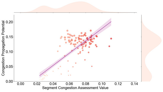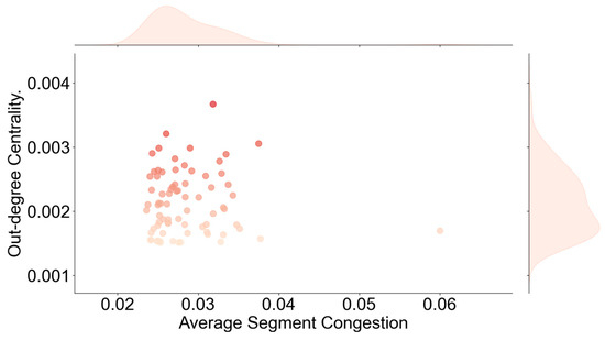 In this graph, it is observed that segments with high out-degree centrality—acting as congestion-propagation sources—exhibit an average congestion assessment value concentrated between 0.023 and 0.038, a level that did not reach “Jam” state in the previous congestion state identification. On the other hand, although these segments account for only 10% of all segments, they propagate 40.42% of the total congestion in the network. This phenomenon arises because these segments connect to others that can rapidly accommodate or absorb congestion. Consequently, whenever these segments begin to show a congestion trend, even though their own congestion state is not severe, they quickly disseminate congestion signals.