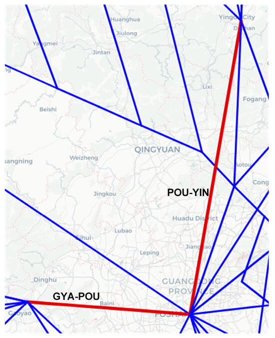 After thoroughly investigating the spatial relationships of congestion propagation in the air route network under different time lags, the analysis then shifts toward the temporal dimension. By comparing the variations in CPP and CPF over time, the dynamic characteristics of congestion propagation across different time periods can be deeply analyzed, thereby revealing the temporal propagation patterns of congestion. For example, the segment pair GYA-POU and POU-YIN serve as a typical analysis object because both are connected to numerous other segments and have a significant impact on the stability and operational efficiency of the entire air route network. The specific structure is shown in Figure 17.
