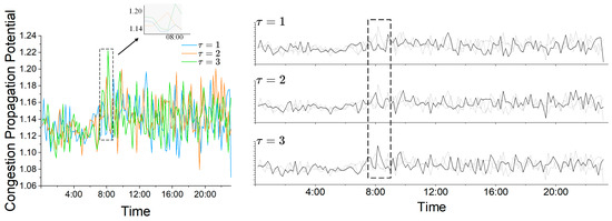 Taking GYA-POU and POU-YIN as examples, we analyze the CPP between these segments. As shown in Figure 18, during the early-morning hours, the CPP is significantly low due to reduced traffic volume, and the system remains relatively stable. At 8:00, a pronounced peak emerges; notably, the curve for reaches its highest value, and the peak values for 1, 2, and 3 gradually increase. This suggests that during peak periods, congestion not only intensifies over time but also diffuses more broadly, as evidenced by a marked increase in propagation potential.