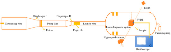 In this work the projectiles were 8 mm diameter Al-spheres (6061-T6 Al) (Yasite company, Jinhua, China), and a red sandstone cube with a size of 100 mm served as the impact target. Red sandstone impact tests were carried out using a 30 mm smooth-bore ballistic (DBR30) driven by gaseous detonation from the Institute of Mechanics, Chinese Academy of Sciences [26,27], as shown in Figure 1. The main body of the bombing driver of the secondary light cannon balloon (DBR30) mainly includes the hypervelocity transmitter main body (explosion tube and compression pipe), test section, and recycling section, as shown in Figure 2a. A sabot of low-density high-pressure polyethylene was utilized in the launch system. Nitrogen was pressurized in the test section to achieve projectile–sabot separation. The ballistic target uses a stimulating imaging system, and the impact process of the shooting target was recorded by a high-speed camera (Kirana 5 (Pitstone, UK)), as shown in Figure 2b. The camera sampling frame rate was 75,000 Hz, and the speed of the incident projectile was measured by laser velocimetry system. The optical path was visualized using a schlieren imaging system, as shown in Figure 2c. The sandstone specimen was wrapped by insulating tape to prevent the rock from collapsing. The sandstone was suspended in the target chamber with two steel wire ropes, configured as a ballistic pendulum, as shown in Figure 2d. A polyvinylidene fluoride (PVDF) sensor was employed to capture the impact response of the center point behind the sandstone. In order to preserve the high-frequency characteristics of the signal, the sampling frequency of the oscilloscope was set to 10 MHz. The sampling time was not less than 2 ms, and the trigger voltage was 210 mV.