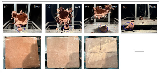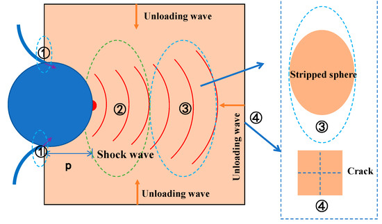Due to the limited size of the target, the shock attenuation transmitted to the lateral surface and the lower surface will produce an unloading wave. The dynamic compressive strength of sandstone is generally 60–200 MPa, and the tensile strength is generally about 1.5 MPa [34,35,36]. Region ② is a high-compression area, and the target is broken and debris splashes from here. The results indicate that the shock pressure in region ③ remains subcritical to sandstone’s compressive strength, while the lower surface edge transfer of shock pressure to an unloading wave can generally reach the tensile strength of sandstone. The interaction of the compression wave and the unloading wave leads to a sphere-stripping effect in region ③. At the same time, tensile cross cracks will also occur in target region ④, as shown in Figure 3.