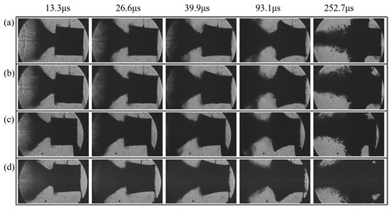 The entire impact process was recorded using high-speed photography with a frame size of 512 × 320 px and a sampling rate of 75,000 Hz. High-speed photography is triggered by the output signal of the laser velocimetry system. Figure 4 shows the projectile perforation process of the projectile hitting that target, as captured by a high-speed camera. After the impact, the central region of the target fragmented, developing an outward-propagating conical jet structure. At the end of the collision, large debris was ejected from the target center.