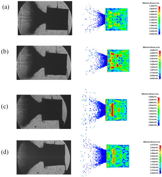 The simulation results are compared with the experimental results under the same circumstances to verify their accuracy, as shown in Figure 5. The simulation and experimental results have equal scaling. At 130 μs, the simulated debris cloud morphology matches experimental observations, exhibiting identical funnel-shaped geometry. The hypervelocity impact formed a crater and debris ejected from the target. The peripheral deformation of the target exhibits velocity-dependent flaring under varying impact velocities. The debris cloud morphology obtained from simulations and experiments is generally consistent.