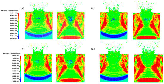 SPH particle maximum principal stress fields in the central section of the target under varied impact velocities: (a) 2891 m/s, (b) 3154 m/s, (c) 3509 m/s, (d) 4453 m/s.