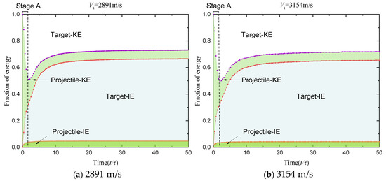 The SPH-simulated maximum principal stress fields in the central section of the target under varied impact velocities are shown in Figure 6. The red region indicates propagation of the unloading wave, and the central green region corresponds to the stripping area, which is consistent with experimental observations. The energy variation during the hypervelocity impact process was also obtained through numerical simulation, as shown in Figure 7. The ratio of kinetic energy to internal energy can be calculated according to the particle velocity during the contact and compression stage (Stage A). It is found that 50% of the kinetic energy of the projectile was transferred to the target, with a portion converted into internal energy to perform work during expansion, thereby inducing a phase transition. The kinetic energy of the target peaks at the end of the contact and compression stage. The initial decline is attributed to reduced particle velocities during shock wave expansion, but this decline continues as excavation flow velocity decreases. In the subsequent stage (after about 10τ, τ = d/Vi; d is the diameter of the projectile; Vi is the speed of the projectile), the ratio of internal energy to total energy of the projectile stabilizes, with most initial energy transferred to the target.