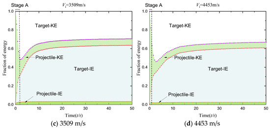 Energy conversion during the impact of different velocities (Projectile-IE represents the internal energy of the projectile, Projectile-KE represents the kinetic energy of the projectile, Target-IE represents the internal energy of the target, and Target-KE represents the kinetic energy of the target).