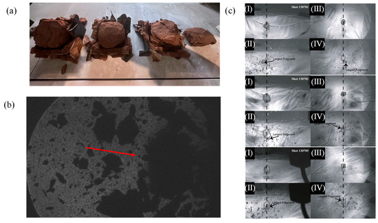 (a) Large stripping spheres detached from the target. (b) The formation of large pellets captured by ultra-high-speed cameras (the red arrow represents the spherical parts). (c) Adriano et al. documented large-scale fragmentation through multi-angle imaging, capturing the largest fragment positions at 14 ms, 20 ms, and 24 ms post-impact, temporally referenced against the target’s original morphology [32].