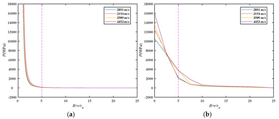 Then the equation can be numerically integrated to obtain the dimensionless attenuation law during the impact process, as shown in Figure 9a. However, due to the size effect of the target, the shock wave produces an unloading wave that catches up with the shock surface during the unloading process. It is necessary to determine the unloading pressure, considering the sparse wave produced under the simulation conditions. The unloading pressure was simulated by taking one SPH particle every ten particles in the impact direction and connecting its pressure into a curve. It can be seen that, at R = 5 to the left, the shock wave attenuation pressure calculated theoretically is greater than that of SPH simulation and then tends to be stable when R > 5.