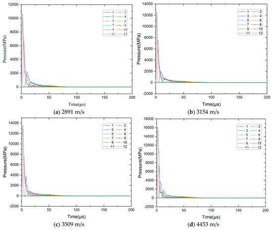 The temporal shock wave attenuation in the impact direction obtained by simulation is shown in Figure 10. According to the peak pressure decay profile, the diameter of the stripping spheres can be roughly estimated as illustrated in Appendix A—Figure A2. The dimensionless mass/size of stripping balls obtained by experiments/simulations is shown in Figure 11. It is indicated that impact velocity correlates inversely with residual spall diameter. Such an unloading of shock waves is an important cause of stripping failure.