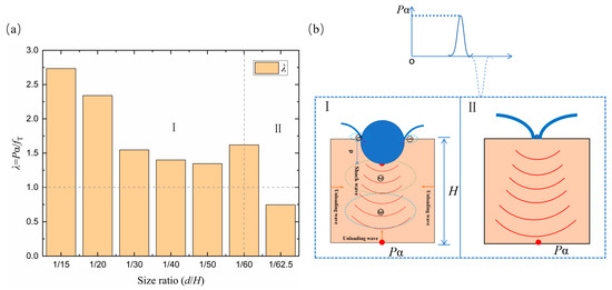 To investigate the scaling effects of projectile/target dimensions on failure characteristics, the HVI of different projectile body and target sizes were simulated at 3000 m/s. λ is defined as the ratio of the peak shock pressure at the target’s backside center (red dot in Figure 13b) to the tensile strength of the target. λ = Pα/fT, where Pα is the peak shock pressure at the center of the back of the target, and fT is the tensile strength of the target. The peak pressure at this position corresponds to the pressure rise from the shock wave’s initial arrival at the interface, with subsequent unloading initiating at this peak. It is the obvious difference between the compressive strength and the tensile strength of sandstone that induces size-dependent fracture mechanisms in HVI failure. Variation of ratio λ with the size ratio is obtained, as shown in Figure 13. λ decreases as the size ratio reduces, falling below 1 beyond a critical threshold. This indicates that shock unloading at such ratios will not lead to tensile failure generation, consistent with the semi-infinite target impact response. λ greater than 1 will produce damage in region ③, in the pattern shown in Figure 12. The damage to the target can be classified into Class I or Class II damage, according to variation in λ. Class I failure features the stripping effect, with retention of large, spherical fragments. Class II failure features traditional cratering and crushing, which generally occurs in the case of large target size and is consistent with the impact effect of a semi-infinite target.
