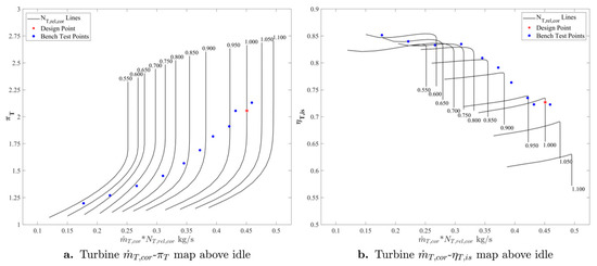 The corrected above-idle characteristics of the compressor and turbine are presented in Figure 1 and Figure 2, respectively. Both figures indicate the design point and locations of the 10 steady-state test points. For clarity in displaying the relative corrected speed values corresponding to each speed line, the number of speed lines shown is fewer than the actual count. However, the lowest and highest speed lines from the original component characteristics, along with the design speed line (where the relative corrected speed equals 1.0), are all retained in the plots.