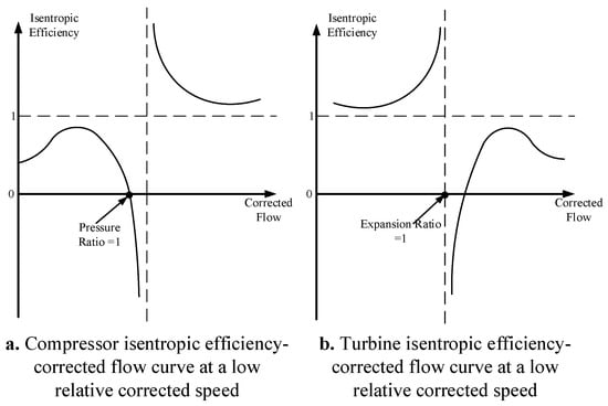 When the relative corrected speed is low, considering the relative corrected speed is kept constant, the isentropic efficiencies of the compressor and turbine vary with the corrected mass flow rate, as shown in Figure 3. It can be seen that the isentropic efficiency is discontinuous. Therefore, to make the extrapolation results reasonable and adequately reflect the unique operating modes of the components, it is necessary to overcome the impact of the discontinuity in isentropic efficiency.