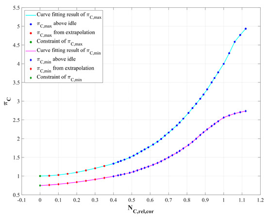 For the micro-turbojet engine in this study, we employed the Piecewise Cubic Hermite Polynomial Interpolation (PCHPI) method to fit and extrapolate both maximum and minimum pressure ratios above idle speed, with the results shown in Figure 4. Given the absence of experimental data at zero speed, the minimum pressure ratio at standstill was assigned a value of 0.75 to maintain extrapolation smoothness while respecting thermodynamic plausibility.